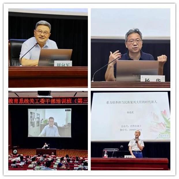 专题报告环节,教育部关工委常务副主任杨贵仁,结合学习贯彻中办、国办46号文件和教育部党组34号文件,就新时代如何认识关工委工作的重要性、新时代教育系统关工委所承担的主要任务、高等教育领域关工委重点工作,以及如何搞好关工委的自身建设进行了详细阐述,并提出了明确要求;山东大学马克思主义研究院教授周向军,从汲取奋斗的力量、真理的力量、精神的力量以及汲取力量的行动指南等方面,对党的二十大精神进行了全面、深刻的解读;武汉大学中国优秀传统文化研究中心教授杨华,从礼学、礼制、中国文化史的概念,中国传统礼制的分类和内容,传统礼制与中国古代日常生活三个方面,对中国传统礼制进行深入浅出的讲解;教育部高等教育司副司长武世兴,深入阐释了党的二十大对教育的新部署新要求,深刻解读了当前高等教育的新形势新任务,全面介绍了中国高等教育取得的历史成就和存在的主要问题,详细讲解了国家推进高等教育改革创新、全面提高人才自主培养质量的相关战略举措;“时代楷模”、大连海事大学马克思主义学院教授曲建武,分享了担任高校辅导员数十年的经历与感悟,讲述了作为高校辅导员如何践行铸魂育人的初心和使命,极大激发了学员做好新时代关心下一代工作的信心和决心。