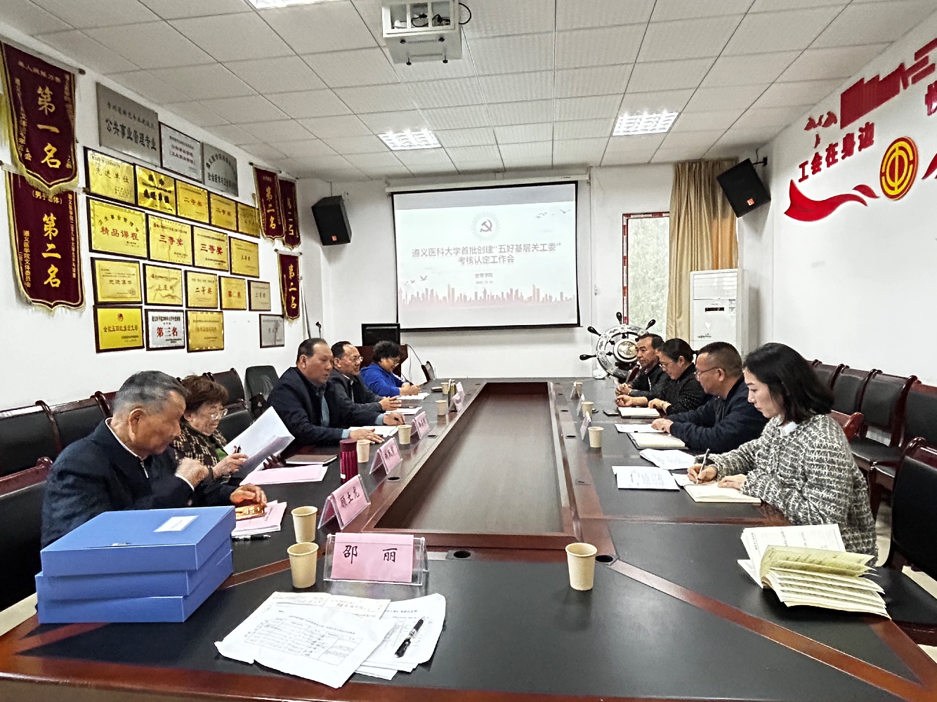 考核认定组由李实明、钱民章、顾土龙、田宗远、冷运琴、邵丽等同志组成。考核认定工作全程由关工委常务副主任李实明主持。接受考核认定的学院分别是:全科医学院、基础医学院、公共卫生学院、药学院、医学影像学院、护理学院、管理学院。考核认定组通过实地走访、现场听取PPT汇报、查阅资料、按认定标准照评分,现场反馈得分。最后7个学院均在90分以上。考核认定组一致认为:7个二级学院在前两次检查的基础上有较大的提高,工作有亮点,措施有特色,今后有方向。本次考核认定工作对我校关工委下一阶段“五好关工委”创建工作提供了借鉴。授牌将于明年开学后举行。