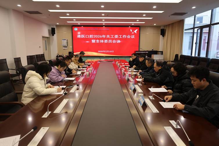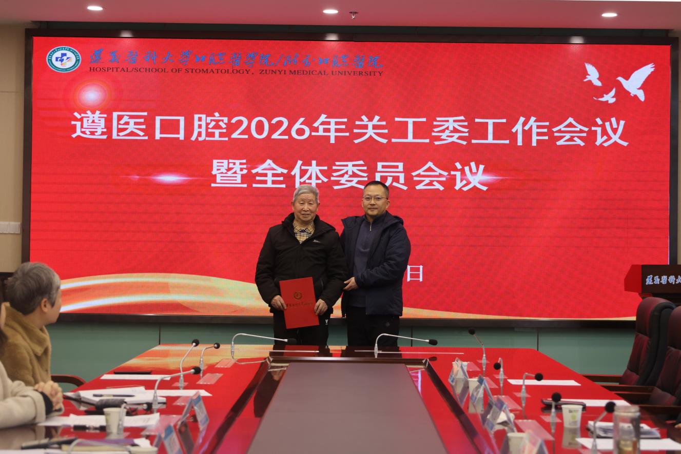 2026年2月10日,遵义医科大学口腔医学院(附属口腔医院)2026年关工委工作会议暨全体委员会议在附属口腔医院行政楼会议室召开。会议总结2025年关心下一代工作成效,部署2026年重点任务,进一步凝聚关工委与“五老”代表力量,推动口腔医学院关心下一代工作走深走实。院党委书记、院长、关工委主任李航,党委副书记、关工委副主任白国辉,党委委员、副院长、关工委委员吴家媛出席会议,“五老”代表、相关职能部门负责人及优秀学生代表共14人参加会议,会议由白国辉主持。李航为退休教师滕久军颁发关工委工作顾问聘书。 (供稿:口腔医学院)